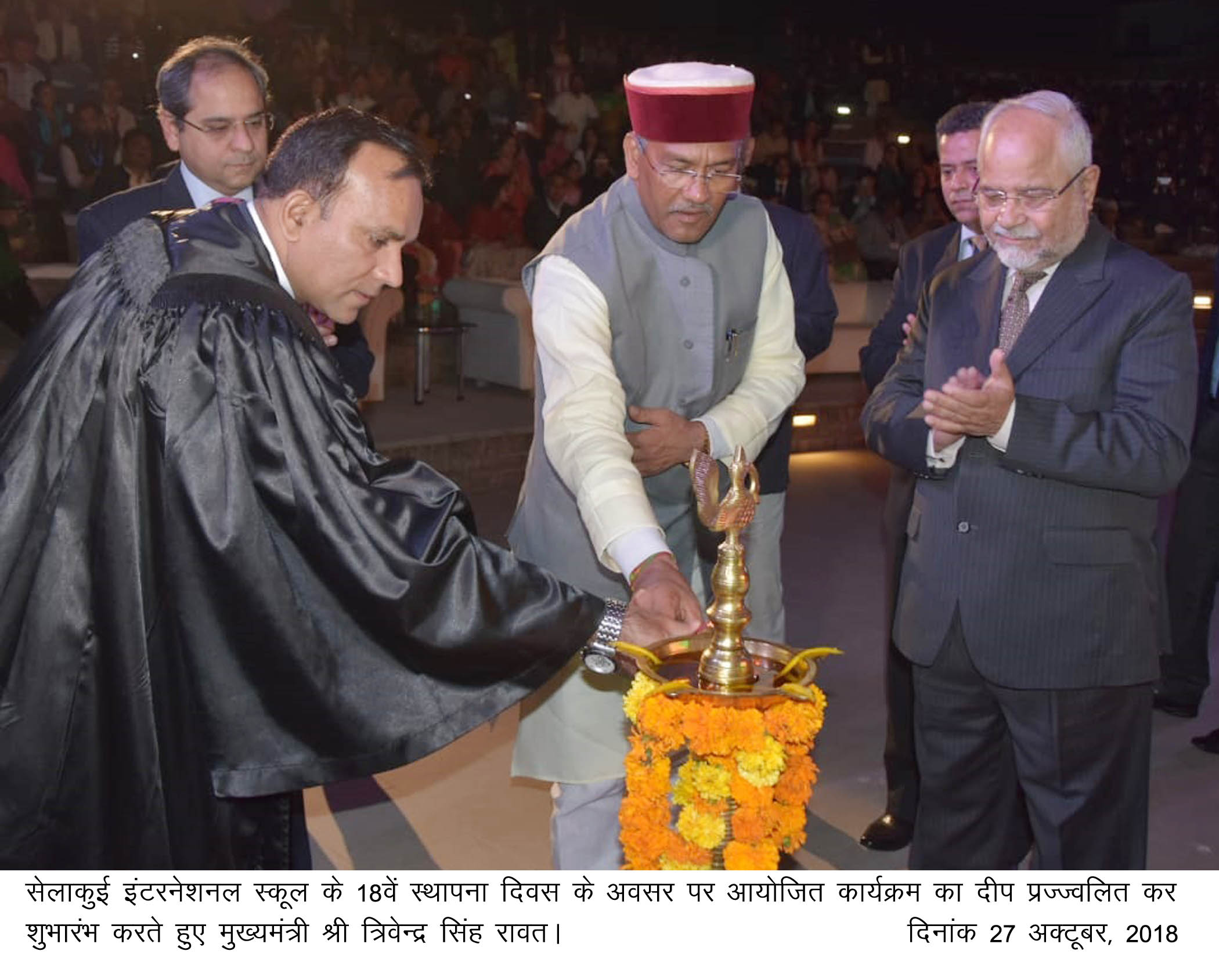 मुख्यमंत्री  त्रिवेन्द्र सिंह रावत  सेलाकुई इंटरनेशनल स्कूल के 18वें स्थापना दिवस समारोह मे सम्मिलित हुए। मुख्यमंत्री ने स्कूल के मेधावी छात्र-छात्राओं को पुरस्कार वितरित करते हुए छात्रों का आह्वान किया कि उन्हें शिक्षा के साथ ही मैं से हम एवं सेल्फ से सोसाइटी की ओर भी सोचना होगा। यही शिक्षा की भी सफलता है। उन्होंने कहा कि आधुनिक सूचना तकनीकि का उपयोग भी हमें मैं से हम के लिये करना होगा तभी आधुनिक तकनीकि का अर्थ साकार हो सकेगा। उन्होंने इसमें आम आदमी की भागीदारी कैसे सुनिश्चित हो सकती है इस पर भी ध्यान देने को कहा।
