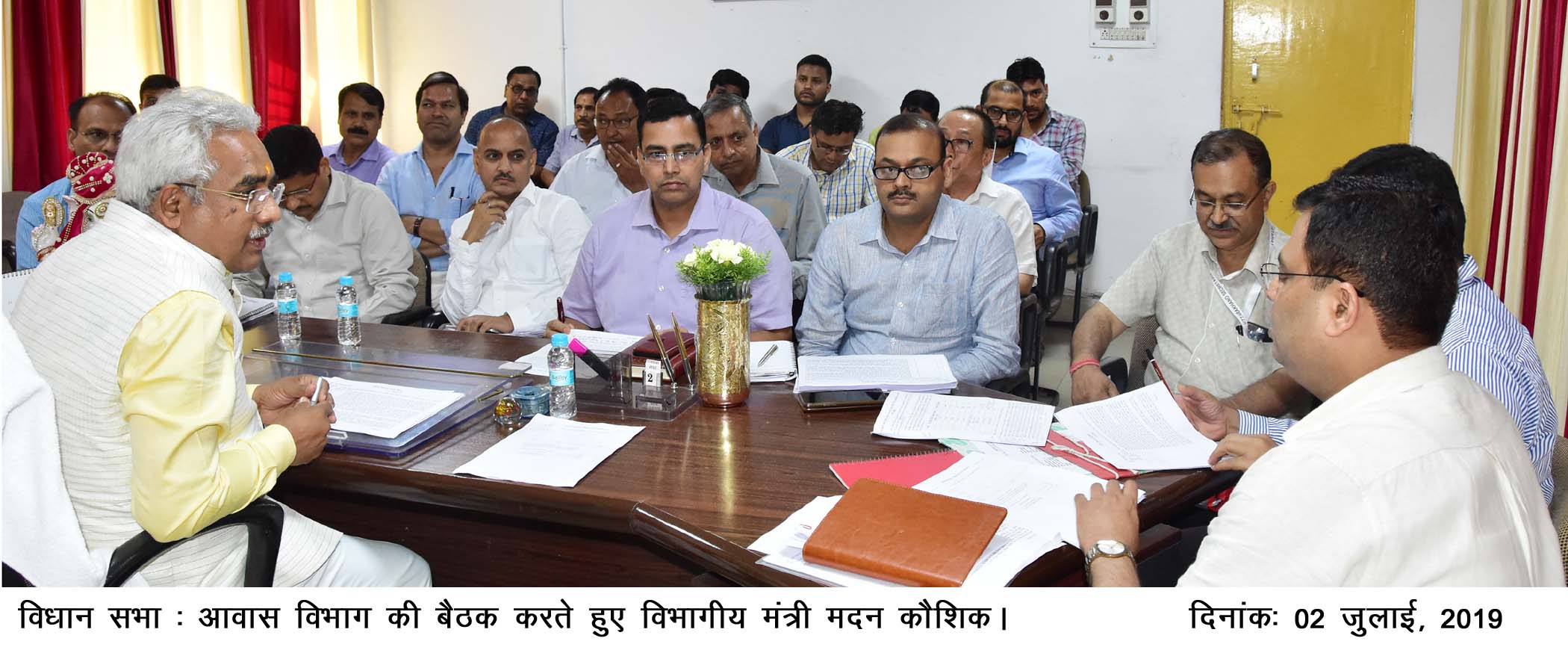 प्रदेश के शहरी विकास, आवास, राजीव गाँधी शहरी आवास, जनगणना, पुनर्गठन एवं निर्वाचन मंत्री मदन कौशिक ने विधान सभा स्थित कार्यालय कक्ष में बैठक लेते हुए कहा कि आवास नीति को जन सामान्य की सुविधा को देखते हुए अधिक व्यवहारिक बनाया जाय। इस सम्बन्ध में उन्होंने कहा कि नक्शा पास करने एवं आवेदन का निस्तारण जल्द किया जाए।