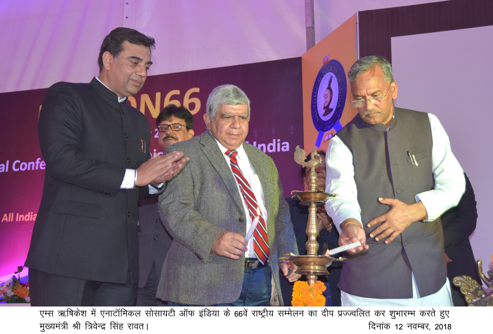 मुख्यमंत्री त्रिवेन्द्र सिंह रावत ने एम्स ऋषिकेश में एनाटाॅमिकल सोसायटी आफॅ इंडिया के 66वें राष्ट्रीय सम्मेलन का दीप प्रज्ज्वलित कर शुभारम्भ किया। इस अवसर पर उन्होंने ‘‘नेटकाॅम-66’’ की पुस्तिका का विमोचन भी किया। एनाटाॅमिकल सोसायटी आॅफ इंडिया द्वारा विभिन्न क्षेत्रों में सराहनीय कार्य करने वालो को सम्मानित भी किया गया।