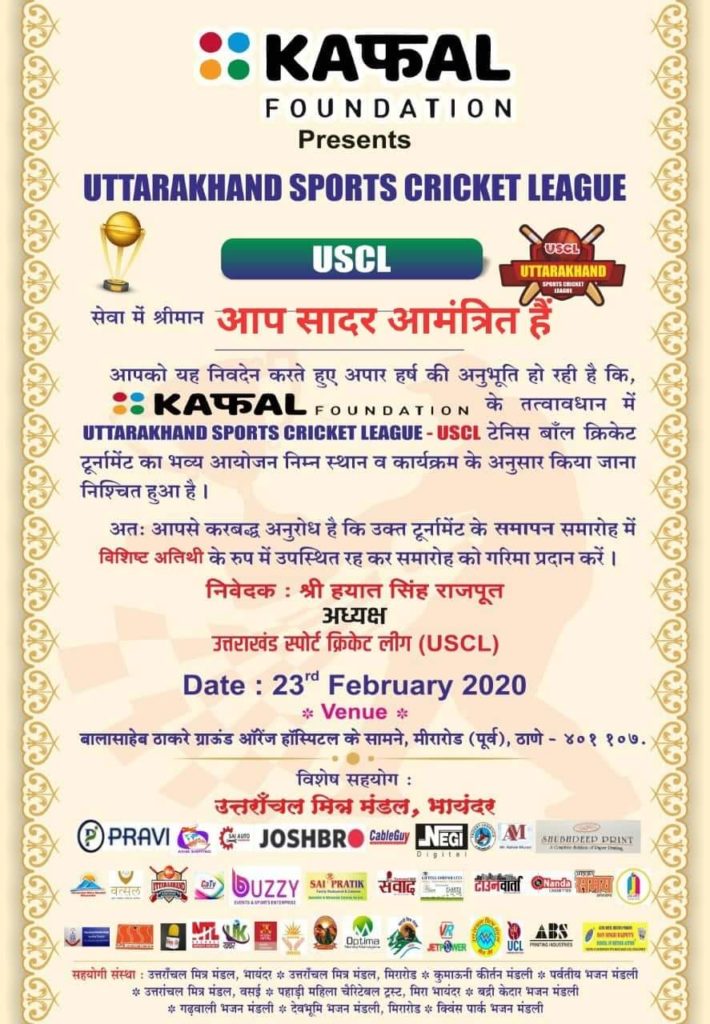 मुंबई में सामाजिक संगठन काफल फाउंडेशन द्वारा उत्तराखंड स्पोर्ट्स क्रिकेट लीग (USCL) का आयोजन 23 फरवरी से किया जा रहा है। बालासाहेब ठाकरे ग्राउंड, आरेंज हास्पिटल के सामने, मीरा रोड (पू.) में 22 व 23 फरवरी को होने वाले क्रिकेट टूर्नामेंट में कुल 16 टीमें भाग लेंगी। टीमों में प्रतिभाग करने युवाओं का मूल उत्तराखंडी होना अनिवार्य शर्त है।