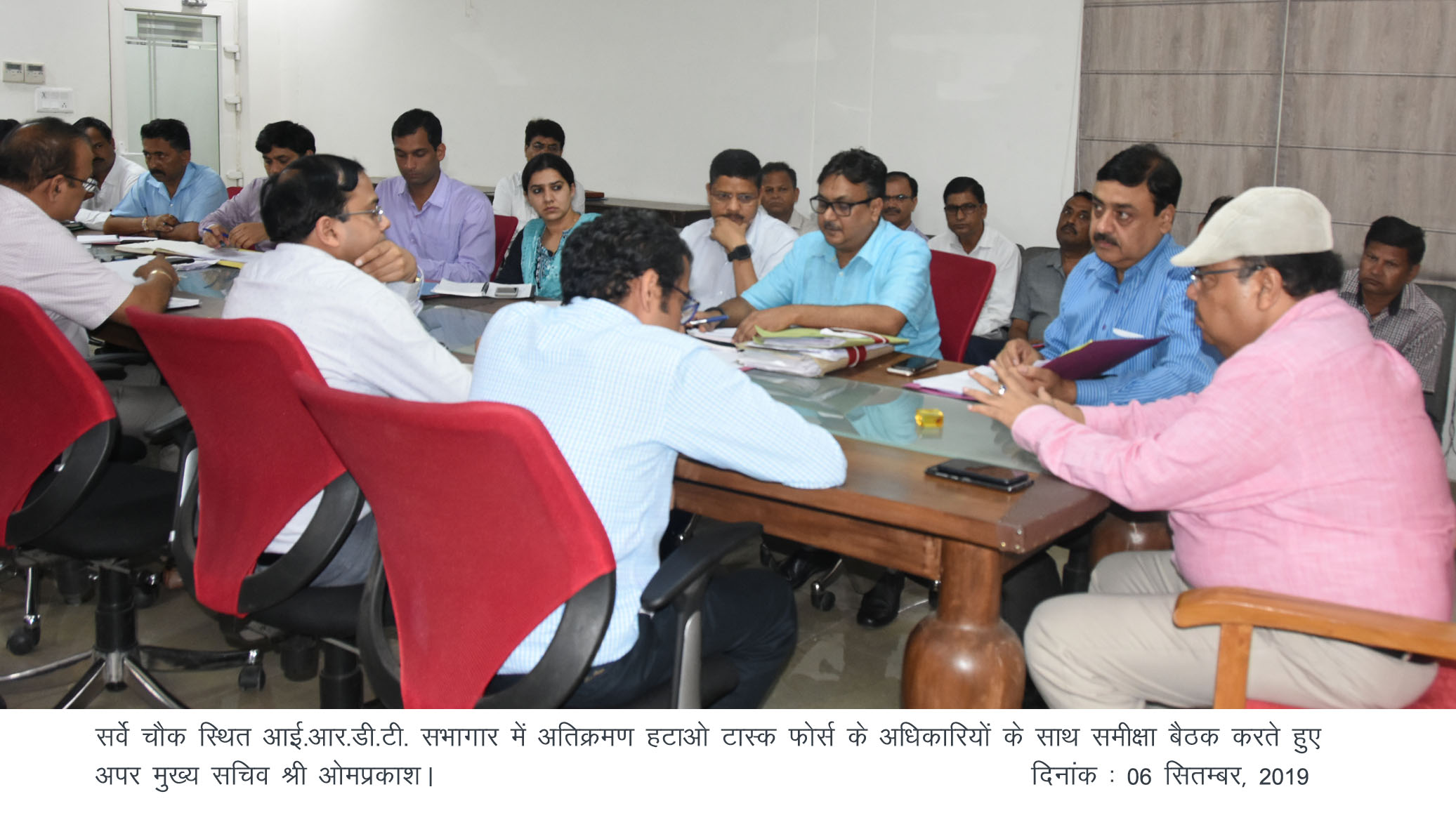 अपर मुख्य सचिव ओमप्रकाश ने शुक्रवार को महिला औद्योगिक प्रशिक्षण संस्थान, सर्वे चैक स्थित आई.आर.डी.टी. सभागार में अतिक्रमण हटाओ टास्क फोर्स के अधिकारियों के साथ अवैध अतिक्रमणों के ध्वस्तीकरण, अतिक्रमणों के चिन्हीकरण व अवैध भवनों में किये जा रहे सीलिंग व इस संबंध में आगामी कार्ययोजना की समीक्षा बैठक की।