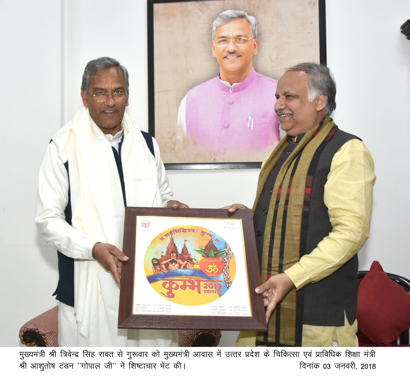 मुख्यमंत्री त्रिवेन्द्र सिंह रावत से गुरूवार को मुख्यमंत्री आवास में उत्तर प्रदेश के चिकित्सा एवं प्राविधिक शिक्षा मंत्री आशुतोष टंडन ‘‘गोपाल जी’’ ने शिष्टाचार भेंट की। उन्होंनें मुख्यमंत्री को प्रयागराज कुंभ मेला-2019 में सम्मिलित होने के लिये उत्तर प्रदेश के मुख्यमंत्री श्री योगी आदित्यनाथ की ओर से आमंत्रित किया। मुख्यमंत्री ने आमंत्रण स्वीकार करते हुए प्रयागराज में आयोजित हो रहे कुंभ मेले को सकुशल सम्पन्न होने की कामना की। उन्होंने उत्तर प्रदेश के मुख्यमंत्री योगी आदित्यनाथ का आभार व्यक्त करते हुए कहा कि उत्तर प्रदेश एवं उत्तराखण्ड प्रयागराज व हरिद्वार में आयोजित होने वाले कुंभ की परम्पराओं से भी जुडे है। उन्होंने उत्तराखण्ड की ओर से प्रयागराज में आयोजित कंुभ मेले की सफलता के लिये सभी आवश्यक सहयोग का भी आश्वासन दिया।