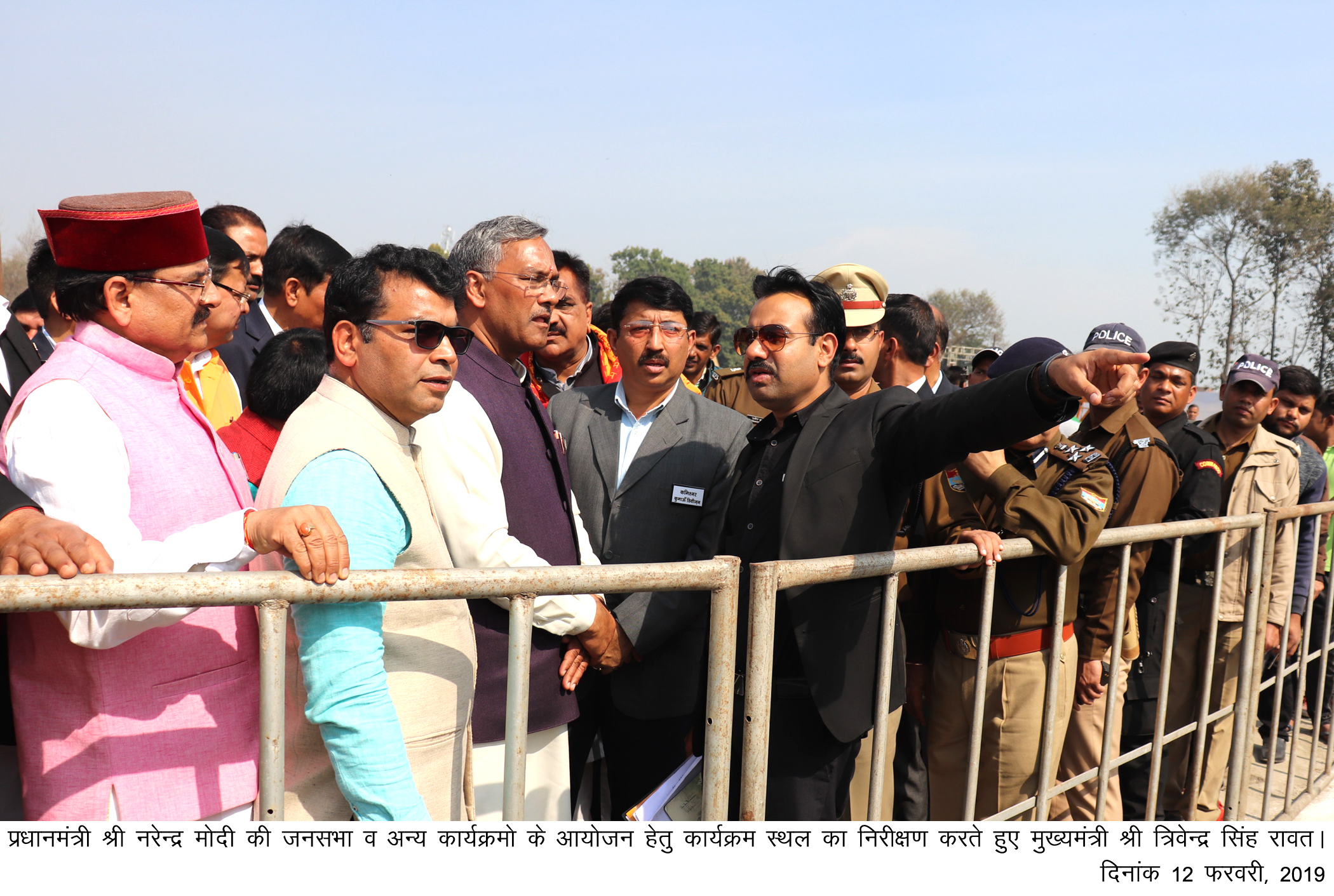 आगामी 14 फरवरी को रूद्रपुर में प्रधानमंत्री नरेन्द्र मोदी की जनसभा व अन्य कार्यक्रमो के सफल आयोजन हेतु प्रदेश के मुख्यमंत्री त्रिवेन्द्र सिंह रावत द्वारा मंगलवार को प्रस्तावित कार्यक्रम स्थल पर विधिवत भूमि पूजन किया गया। मुख्यमंत्री त्रिवेन्द्र ने रैली व्यवस्थाओं का स्थलीय निरीक्षण कर सम्बन्धित अधिकारियों को आवश्यक दिशा निर्देश दिये। उन्होने कहा कि जनपद उधमसिंह नगर में प्रधानमंत्री श्री मोदी की यह तीसरी रैली ऐतिहासिक व अभूतपूर्व होगी। प्रधानमंत्री के उत्तराखण्ड आगमन को देखते हुये पूरे प्रदेश मेे जोश है। रैली में कुमांऊ मण्डल के साथ-साथ गढवाल मण्डल के लोग भी बड़ी संख्या में भाग लेगंे।