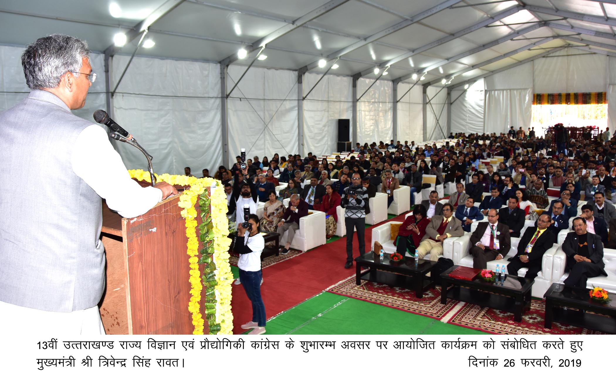 इससे पूर्व मुख्यमंत्री त्रिवेन्द्र ने दीप प्रज्ज्वलित कर कार्यक्रम का शुभारम्भ किया तथा विज्ञान तथा प्रौद्योगिकी के क्षेत्र में बेहतर कार्य करने वाले वैज्ञानिक डाॅ.दिलीप कुमार उप्रेती, वैज्ञानिक प्रो. प्रीति गंगोला जोशी के साथ ही डाॅ.ममता सिंह को बेस्ट सांइस टीचर का एवार्ड प्रदान किया। मुख्यमंत्री त्रिवेन्द्र ने विज्ञानधाम के परिसर तथा प्रस्तावित सांइस सिटी के स्थल का भी निरीक्षण किया। उन्होंने कहा कि सांइस सिटी के निर्माण के संबंध में उनकी केन्द्रीय मंत्री महेश शर्मा से भी वार्ता हुयी है। इस अवसर पर मुख्यमंत्री त्रिवेन्द्र ने 13वीं उत्तराखण्ड राज्य विज्ञान एवं प्रौद्योगिकी कांग्रेस की अवस्ट्रैक्ट बुक-2019 तथा उत्तराखण्ड बायोटैक्नोलाॅजी बुक-2018 का भी विमोचन किया।