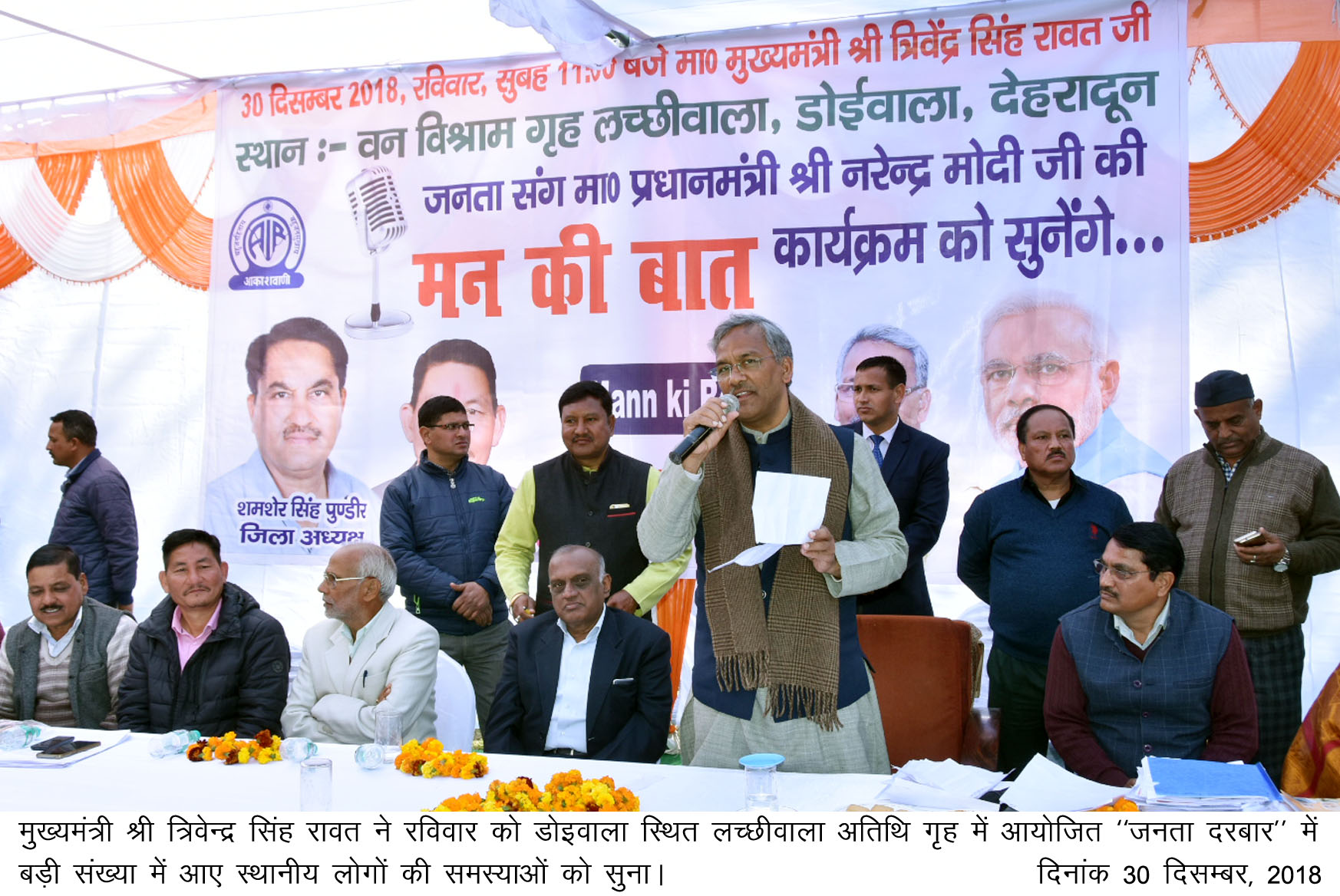 मुख्यमंत्री त्रिवेन्द्र सिंह रावत ने र डोइवाला स्थित लच्छीवाला अतिथि गृह में आयोजित ‘‘जनता दरबार’’ में बड़ी संख्या में आए स्थानीय लोगों की समस्याओं को सुना व उन पर उचित कार्यवाही के निर्देश सम्बन्धित अधिकारियों को दिए। इस अवसर पर मुख्यमंत्री ने राज्य अल्पसंख्यक आयोग के नवनियुक्त अध्यक्ष डा0 आ के जैन को बधाई दी जिन्होंने सीएमआई अस्पताल में अपनी कन्सलटेन्सी सेवाएं निःशुल्क देने तथा डोईवाला क्षेत्र के लोगों को दवाइयों व पूरे इलाज में बीस प्रतिशत छूट देने की घोषणा की। नए वर्ष की शुभकामनाएं देते हुए मुख्यमंत्री ने कहा कि क्षेत्र में विकास के सभी कामों को पूरा किया जाएगा। जनता दरबार में प्राप्त सभी समस्याओं का जल्द से जल्द निराकरण किया जाएगा। राज्य में गत 25 दिसम्बर को श्रद्धेय स्व0 अटल जी के जन्मदिन पर अटल उत्तराखण्ड आयुष्मान योजना का शुभारम्भ किया। उत्तराखण्ड देश में पहला राज्य है जिसने अपने पूरे राज्य के सभी नागरिकों व हर परिवार को आयुष्मान भारत योजना का लाभ देने का साहस किया है। इस योजना का लाभ राज्य के सभी 23 लाख परिवारों को मिलेगा। यह किसी वर्ग विशेष के लिए नही है बल्कि सभी के लिए है।