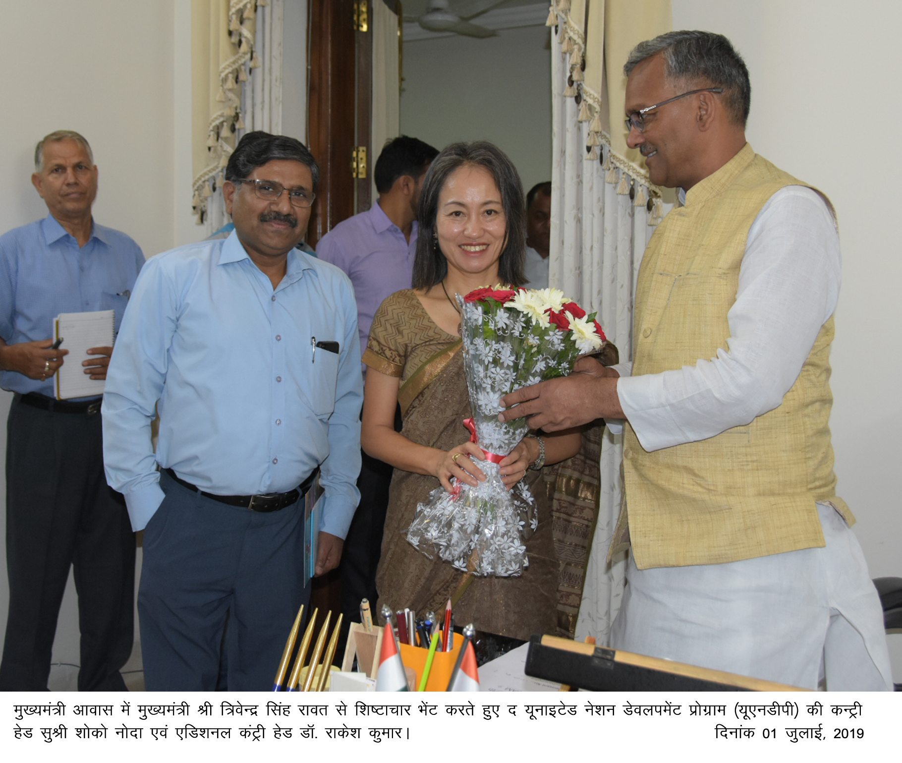 यूएनडीपी की कन्ट्री हेड सुश्री शोको नोदा ने मुख्यमंत्री को उत्तराखण्ड के विकास में हर सम्भव सहयोग का आश्वासन देते हुए कहा कि भारत में यूएनडीपी की कन्ट्री हेड बनने के बाद उत्तराखण्ड से अपने भ्रमण की शुरूआत की है। उन्होंने उत्तराखण्ड में संचालित विभिन्न योजनाओं एवं कार्यक्रमों के विकास में तकनीकि व आर्थिक सहयोग का भी भरोसा मुख्यमंत्री को दिया।