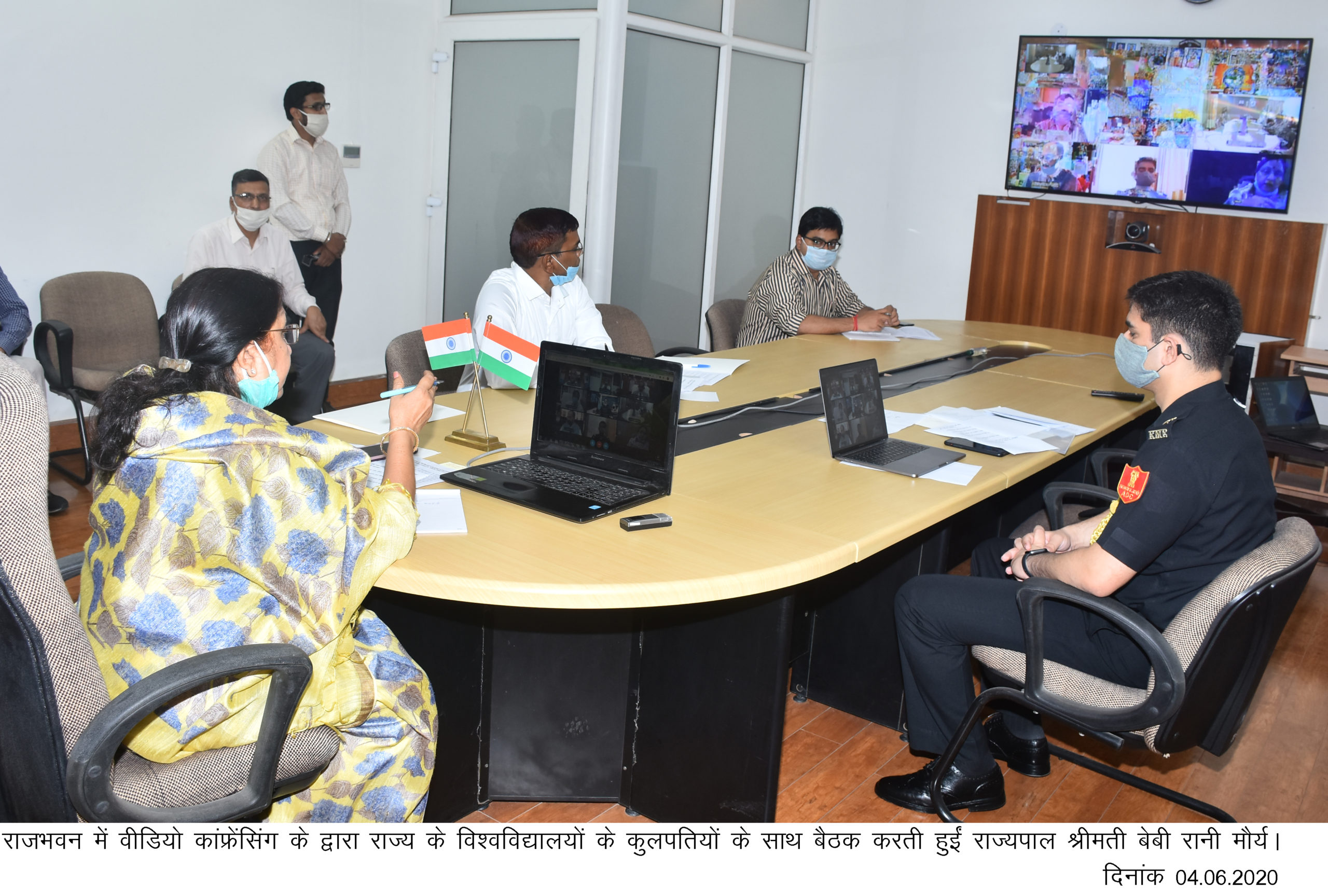 राज्यपाल श्रीमती बेबी रानी मौर्य ने गुरूवार को राजभवन में वीडियो कांफ्रेंसिंग के द्वारा राज्य के विश्वविद्यालयों के कुलपतियों के साथ बैठक की। राज्यपाल श्रीमती मौर्य ने विश्वविद्यालयों से उनकी वर्तमान तथा आगामी सत्रों की कार्ययोजना पूछी। राज्यपाल ने विश्वविद्यालयों से वर्तमान सत्र की लंबित परीक्षाओं को कराने की तैयारी के बारे में पूछा। उन्होंने आनलाइन शिक्षण, कोर्स पूरा होने की स्थिति, शिक्षक, स्टाफ, विद्यार्थियों की सुरक्षा हेतु कार्ययोजना पर बात की।