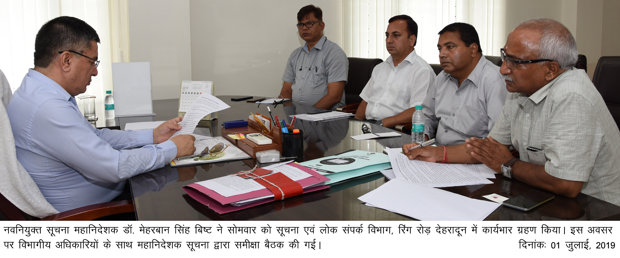 नवनियुक्त सूचना महानिदेशक डॉ. मेहरबान सिंह बिष्ट ने सोमवार को सूचना एवं लोक संपर्क विभाग, रिंग रोड़ देहरादून में कार्यभार ग्रहण किया। इस अवसर पर विभागीय अधिकारियों के साथ महानिदेशक सूचना द्वारा समीक्षा बैठक की गई।