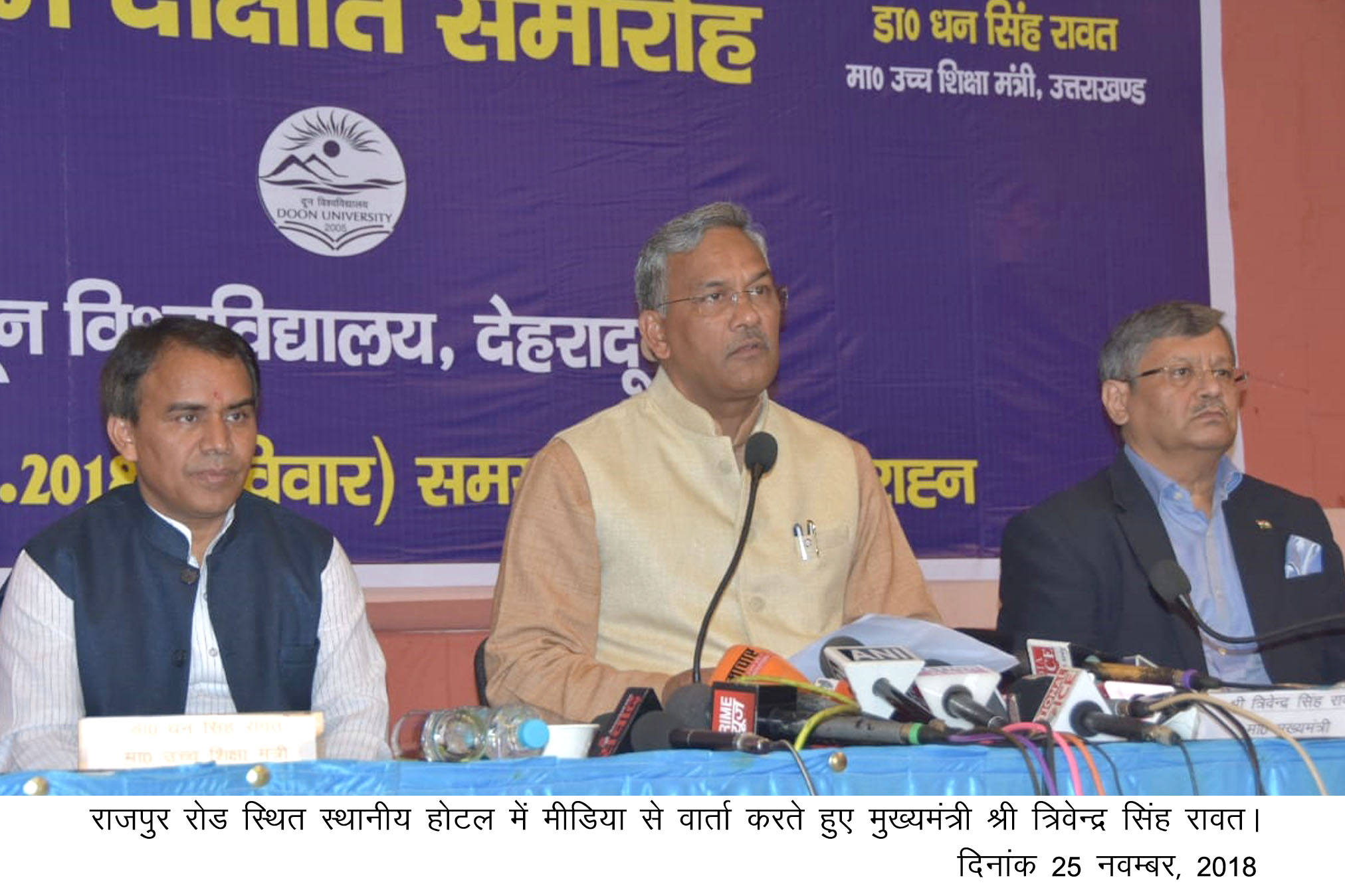 मुख्यमंत्री त्रिवेन्द्र सिंह रावत ने राजपुर रोड स्थित स्थानीय होटल में मीडिया से वार्ता की। मुख्यमंत्री ने कहा कि उच्च शिक्षा के क्षेत्र में सुधार लाने के लिये राज्य सरकार ने अनेक कदम उठाये हैं। शिक्षण और शोध में उल्लेखनीय कार्य करने वाले 05 शिक्षकों का सम्मान देने का निर्णय लिया गया है। यह पुरूस्कार डाॅ.भक्तदर्शन के नाम से जाना जायेगा। विश्वविद्यालयों में गढवाली व कुमांऊनी भाषा के केन्द्र स्थापित किये जायेंगे। इसका उद्देश्य क्षेत्रीय भाषाओं को प्रोत्साहित करना है।