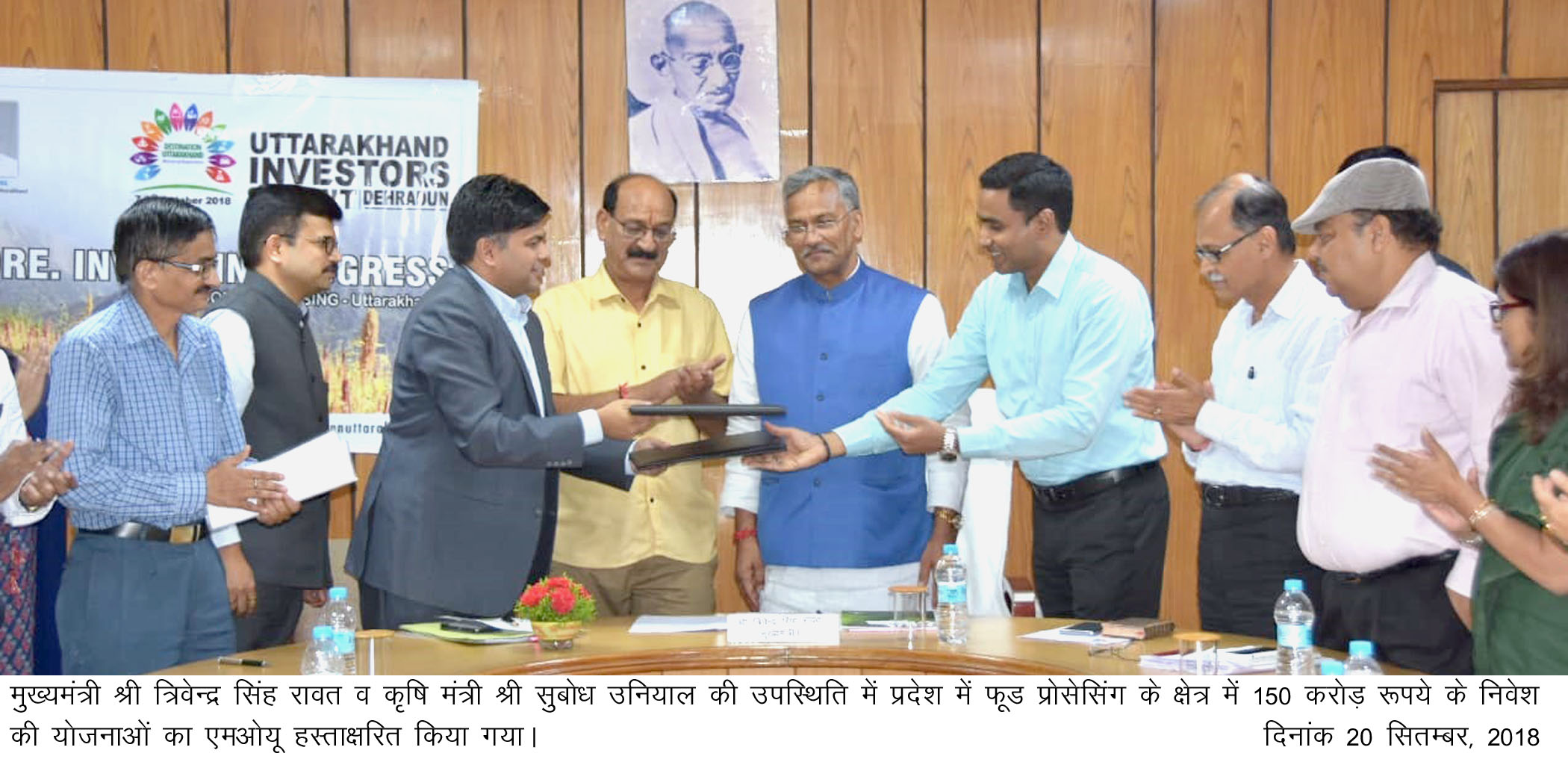 मुख्यमंत्री त्रिवेन्द्र सिंह रावत व कृषि मंत्री सुबोध उनियाल की उपस्थिति में गुरूवार को विधानसभा स्थित मुख्यमंत्री कार्यालय सभागार में प्रदेश में फूड प्रोसेसिंग के क्षेत्र में 150 करोड़ रूपये के निवेश की योजनाओं का एमओयू हस्ताक्षरित किया गया। एमओयू पर सचिव कृषि व खाद्य प्रसंस्करण डी.सेंथिल पाण्डियन व मैसर्स रॉकेट रिद्धि-सिद्धि प्रा.लि., गोरेगांव, मुम्बई के प्रबन्ध निदेशक रोहित मार्कन के मध्य एमओयू हस्ताक्षरित किया गया। रोहित मार्कन ने मुख्यमंत्री को अवगत कराया कि रूद्रपुर में स्थापित मक्का से स्टार्च बनाने वाली भारत की यह सबसे बड़ी यूनिट होगी। इसमें 08 लाख टन मक्के की खपत होगी। जिसमें से 04 लाख टन मक्का उत्तराखण्ड के किसानों से सीधे क्रय किया जायेगा। जबकि बड़ी संख्या में स्थानीय लोगों को रोजगार के अवसर भी उपलब्ध होंगे।