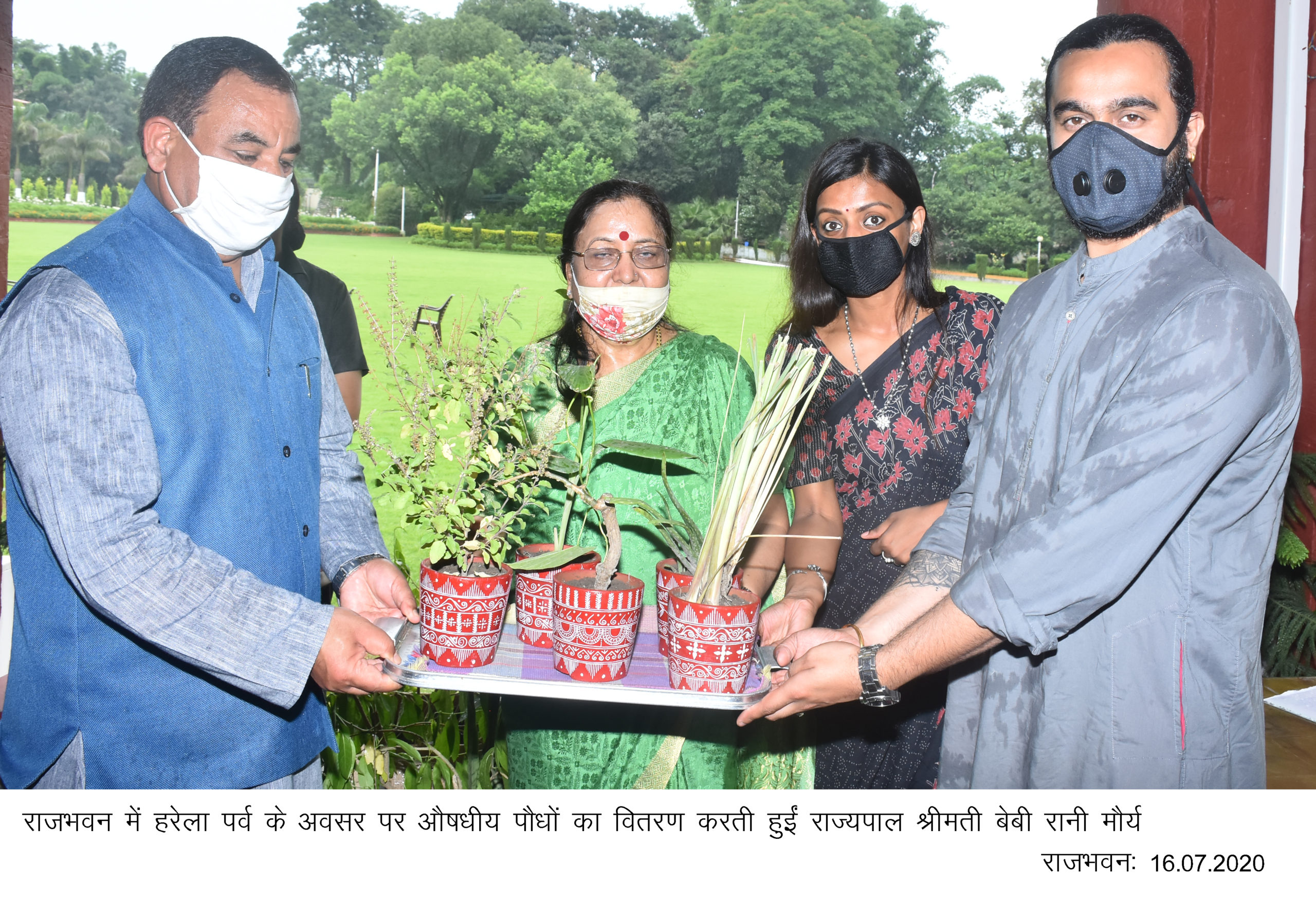 राज्यपाल श्रीमती बेबी रानी मौर्य ने गुरूवार को हरेला पर्व के अवसर पर राजभवन में ग्रामीण महिलाओं के उपयोगार्थ हल्दी, घृतकुमारी, तुलसी, गिलोय, लेमन ग्रास जैसे औषधीय पौधे वितरित किये। राज्यपाल ने कहा कि यह पाॅच पौधे हर घर में होने चाहिए। राज्यपाल ने राजभवन परिसर में ‘मौल श्री‘ और ‘आॅल स्पाइसेस‘ का रोपण भी किया। इस अवसर राज्यपाल श्रीमती मौर्य ने कहा कि स्थिति सामान्य होने पर वे राजभवन में राज्यभर से ग्रामीण महिलाओं को बुलाकर उनसे पर्यावरण संरक्षण, ग्रामीण आर्थिकी और स्वरोजगार पर संवाद करेंगी। कार्यक्रम को सम्बोधित करते हुये राज्यपाल श्रीमती मौर्य ने कहा कि हरेला पर्व उत्तराखण्ड की लोक परम्पराओं तथा लोक संस्कृति से जुड़ा पर्यावरण संरक्षण का महोत्सव है। हरेला पर्व के माध्यम से पर्यावरण संरक्षण का संदेश मिलता है। राज्यपाल श्रीमती मौर्य ने कहा कि वृक्षारोपण के समय औषधीय व स्वास्थ्यवर्द्धक पौधों के रोपण को विशेष महत्व दिया जाना चाहिये। कोविड-19 की वैश्विक महामारी के दौर में पारम्परिक औषधीय पौधो का उपयोग तथा महत्व बढ़ गया है।