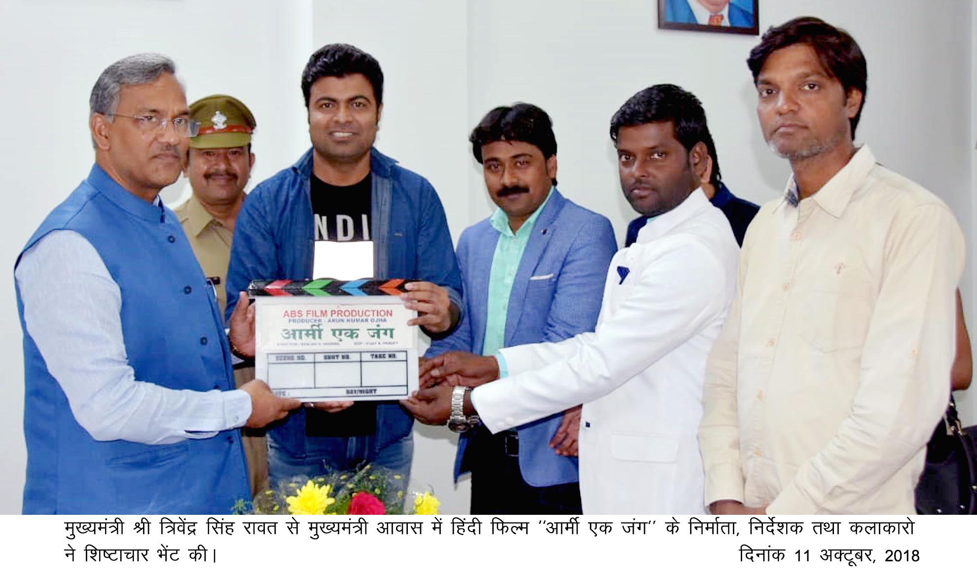 मुख्यमंत्री \त्रिवेंद्र सिंह रावत से मुख्यमंत्री आवास में हिंदी फिल्म ‘‘आर्मी एक जंग’’ के निर्माता, निर्देशक तथा कलाकारो ने शिष्टाचार भेंट की। फिल्म की पूरी यूनिट को बधाई व शुभकामनाएं देते हुए मुख्यमंत्री ने कहा कि उत्तराखण्ड सरकार द्वारा नई फिल्म नीति के तहत राज्य में फिल्म निर्माण और शूटिंग को प्रोत्साहित किया जा रहा है। फिल्म निर्माण व शूटिंग संबंधित सभी अनुमतियों के लिए सिंगल विंडो सिस्टम लागू किया गया है। इस वर्ष उत्तराखण्ड राज्य को फिल्मों के अनुकूल निर्माण हेतु राष्ट्रीय पुरस्कार भी प्रदान किया गया है। राज्य के नैसर्गिक तथा प्राकृतिक सौंदर्य के कारण फिल्म शूटिंग हेतु अपार संभावनाएं हैं। राज्य सरकार फिल्म निर्माताओं को राज्य में फिल्म निर्माण के लिए हरसंभव सहायता व सहयोग देने के लिए सदैव तत्पर है।
