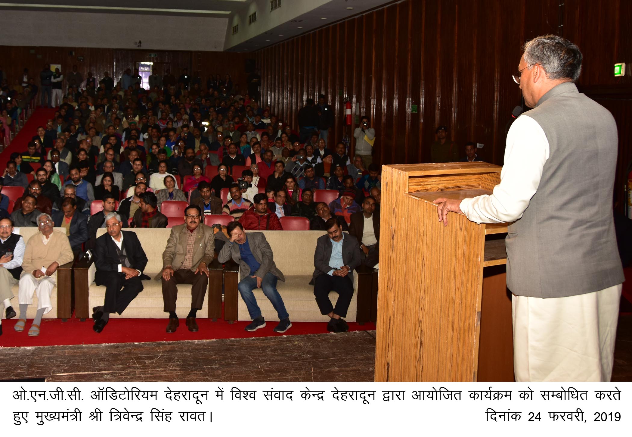 मुख्यमंत्री त्रिवेन्द्र सिंह रावत ओ.एन.जी.सी. आॅडिटोरियम देहरादून में विश्व संवाद केन्द्र देहरादून द्वारा आयोजित एक कार्यक्रम में सम्मिलित हुए। कार्यक्रम के दौरान मुख्यमंत्री ने विश्व संवाद केन्द्र देहरादून द्वारा प्रकाशित वार्षिकी 2018 का लोकार्पण किया। कार्यक्रम को सम्बोधित करते हुए मुख्यमंत्री त्रिवेन्द्र सिंह रावत ने कहा कि विश्व संवाद केन्द्र देहरादून अपनी राष्ट्रवादी पत्रकारिता के माध्यम से समाज के मार्गदर्शन में अपनी महत्त्वपूर्ण भूमिका निभा रहा है।