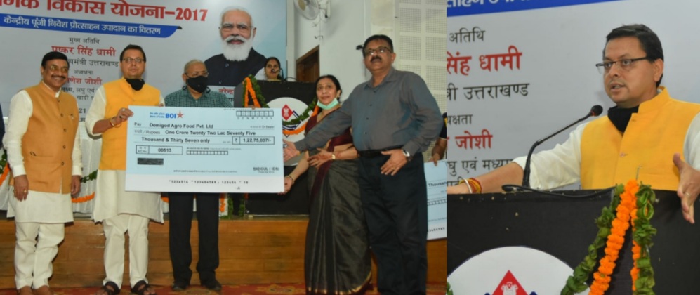 मुख्यमंत्री पुष्कर सिंह धामी ने शुक्रवार को मुख्यमंत्री आवास स्थित कैम्प कार्यालय सभागार में उत्तराखण्ड में औद्योगिक विकास योजना-2017 के स्वीकृत 23 दावों के लाभार्थियों को 35 करोड़ का उपादान वितरित किया। औद्योगिक विकास योजना भारत सरकार के उद्योग संवर्द्धन एवं आन्तरिक व्यापार विभाग द्वारा उत्तराखण्ड एवं हिमाचल प्रदेश के लिये 01 अप्रैल, 2017 से 31 मार्च, 2022 की अवधि तक लागू की गई है। इस योजना में प्लाण्ट एवं मशीनरी में किये कुल पूंजी निवेश के 30 प्रतिशत अधिकतम रू0 05 करोड़ तक का उपादान भारत सरकार से देय है। इसी प्रकार 05 वर्षों हेतु इकाईयों के प्लाण्ट एवं मशीनरी के इनस्योरेंस प्रीमियम की शतप्रतिशत प्रतिपूर्ति भी देय है।