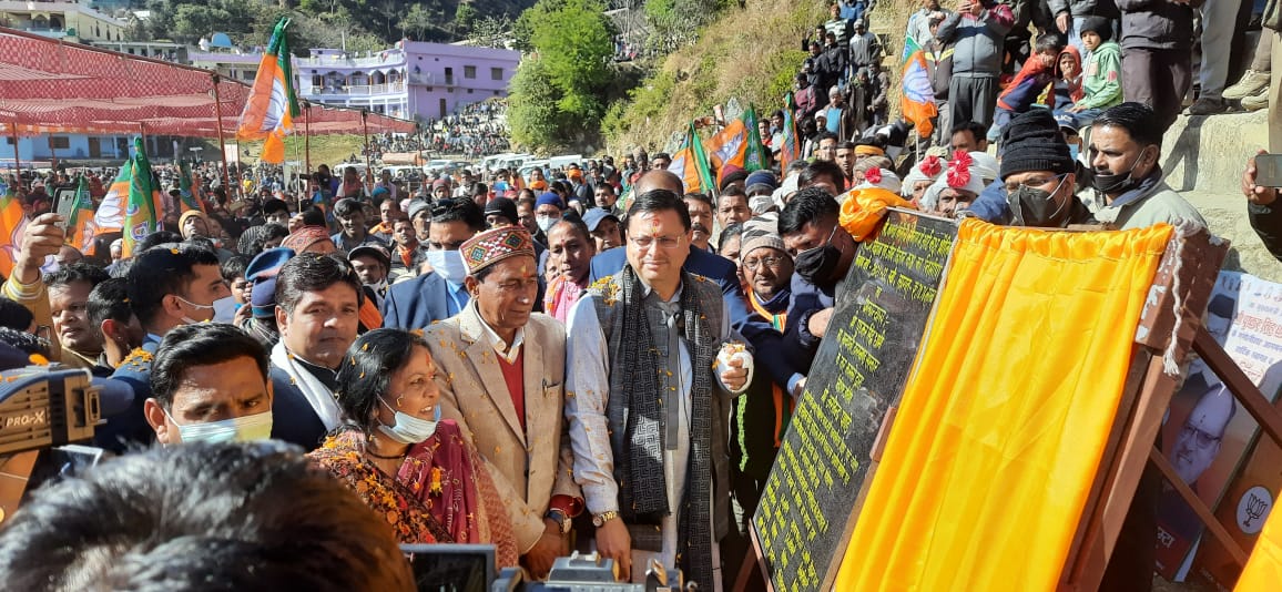 मुख्यमंत्री पुष्कर सिंह धामी ने सोमवार को गंगोलीहाट, पिथौरागढ़ में 21 करोड़ 57 लाख रुपए के 06 कार्यों का शिलान्यास एवं 1 करोड़ 39 लाख की लागत के जीआईसी दशाईथल, गंगोलीहाट का लोकार्पण किया। मुख्यमंत्री ने क्षेत्र के विकास हेतु विभिन्न घोषणाएं की उन्होंने विकासखंड बेरीनाग के ग्राम बेलकोट-उपराडा सड़क को शहीद चारुचंद्र और विकासखंड गंगोलीहाट में जरमाल गांव से कनारा सड़क को वीर चक्र विजेता शहीद शेर सिंह के नाम से कराए जाने की घोषणा की। इसके अतिरिक्त गणाई बनकोट मोटर मार्ग का डामरीकरण एवं सुधारीकरण किए जाने, डंगोली सैलानी- दाडिमखेत-धरमघर, कोटमन्या-पाँख, थल- सातशिलिंग मोटर मार्ग में सुधारीकरण एवं हॉटमिक्स का कार्य अवशेष की घोषणा, बासपटान ग्वाल मोटर मार्ग सेतु सहित (5 कि०मी०) की घोषणा, थर्प बडेत बाफिला मोटर मार्ग के कि०मी० 2 से कमदीना बगदोली बजेत मोटर मार्ग का निर्माण (4 कि०मी०) की घोषणा, मधनपुर काकडा मोटर मार्ग (3 कि०मी०) की घोषणा, पाताल भुवनेश्वर से चौडमन्या मोटर मार्ग (5 कि०मी०) की घोषणा। मडकनाली सुरखाल पाठक मोटर मार्ग का निर्माण, बोगटा से खतीगंव तल्लीसार मोटर मार्ग, चमलेख इंटर कालेज का जीर्णोद्धार, सामुदायिक स्वास्थ्य केन्द्र बेरीनाग में विभिन्न चिकित्सा विशेषज्ञ की तैनाती, चैंलेखवसे क्लोन तक मोटर मार्ग का शीघ्र निर्माण, ड्युड हडाकोट से बड़ेना मोटर मार्ग का शीघ्र निर्माण, गंगोलीहाट में अगले सत्र से पशु चिकित्सा महाविद्यालय खोले जाने की घोषणा समेत क्षेत्र के विकास के लिए विभिन्न घोषणाएं की।