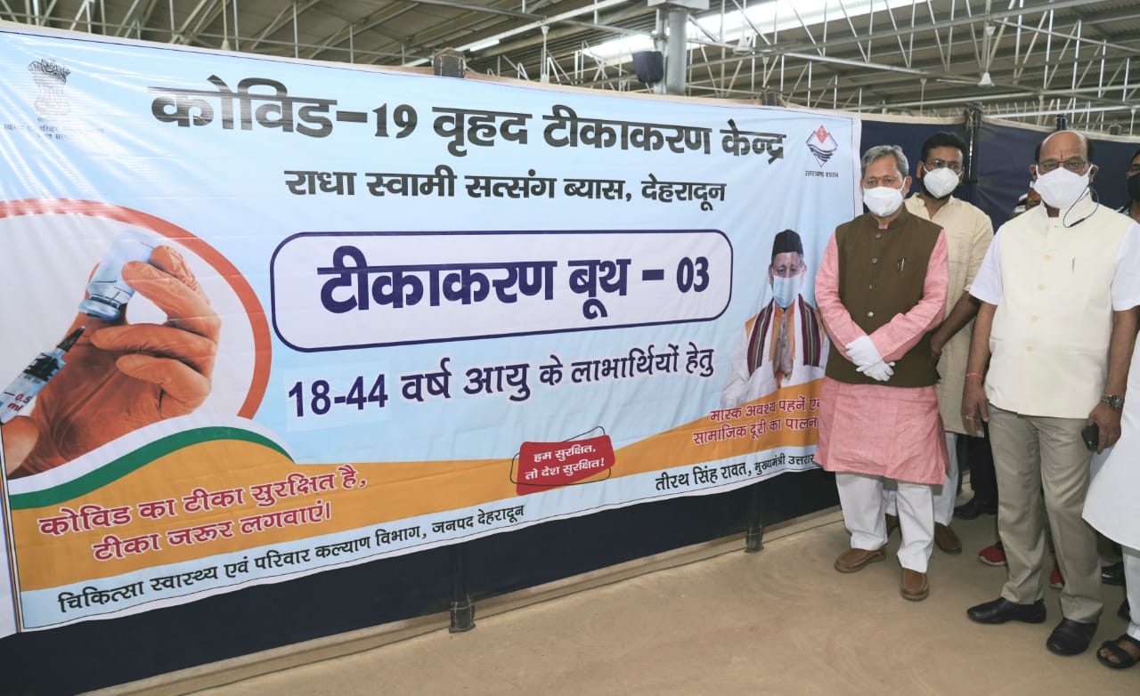 मुख्यमंत्री तीरथ सिंह रावत ने राजधानी देहरादून के हरिद्वार बायपास रोड स्थित राधा स्वामी सत्संग न्यास में 18 से 44 वर्ष के लोगों के टीकाकरण अभियान का विधिवत शुभारंभ किया।
