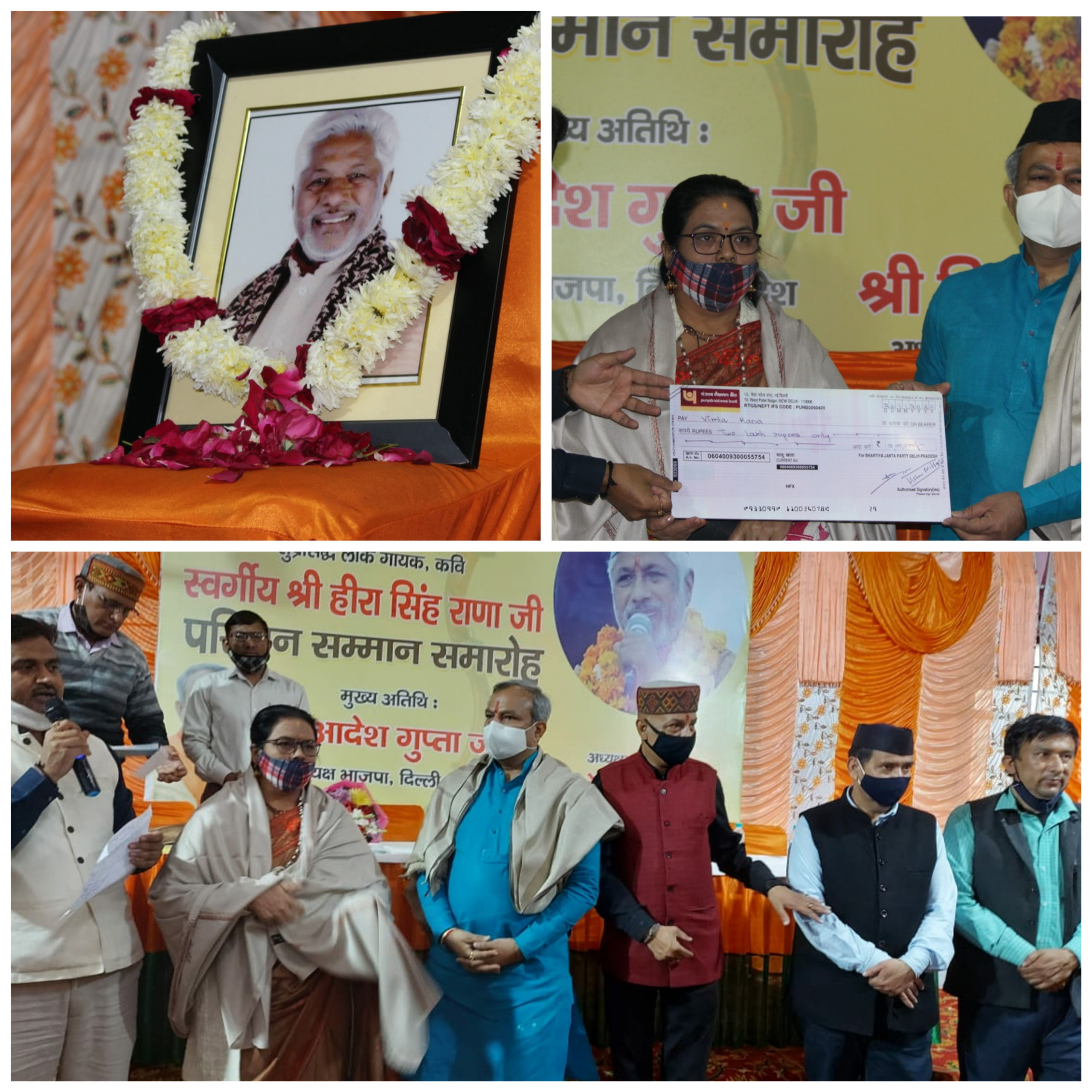 वेस्ट विनोद नगर दिल्ली स्थित दुर्गा मात मंदिर कुमांऊ स्क्वायर में आयोजित एक सादे आयोजन में दिल्ली भाजपा के अध्यक्ष आदेश गुप्ता एवं जिला मयूर विहार भाजपा अध्यक्ष विनोद बछेती ने स्व.हीरा राणा जी की पत्नी विमला राणा एवं पुत्र हिमांशु राणा को दिल्ली बीजेपी के तरफ से सम्मान स्वरूप 2 लाख रूपये की राशि शॉल और पुष्प गुछ प्रदान किया।