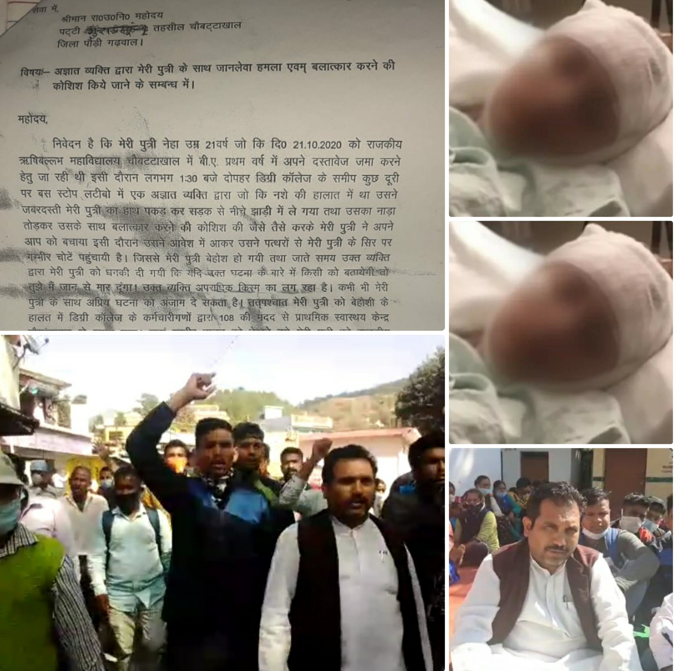 21 बर्षीय छात्रा के पिता सत्यपाल पुत्र स्व. बिशन लाल ने राजस्व पुलिस को दी अपनी तहरीर में घटना क्रम की जानकारी देते हुए लिखा कि उनकी पुत्री अपने जरूरी दस्तावेज जमा करने महाविद्यालय चौबट्टाखाल गयी हुई थी कि वहीं निकट लटिबौ बस स्टैंड के पास खड़ी उनकी बेटी को अज्ञात व्यक्ति जोर जबरदस्ती खींचकर झाड़ियों में ले गया। दिन का समय होने के कारण लड़की का चिल्लाना चीखना किसी को सुनाई नहीं दिया। बलात्कार की कोशिश में उस अज्ञात ने उनकी बेटी का नाडा तोड़ दिया लेकिन बलात्कार करने में नाकाम हुए उस अपराधी द्वारा लड़की को पत्थर मार मार कर बेहोश कर दिया और वहां से फरार हो गया।