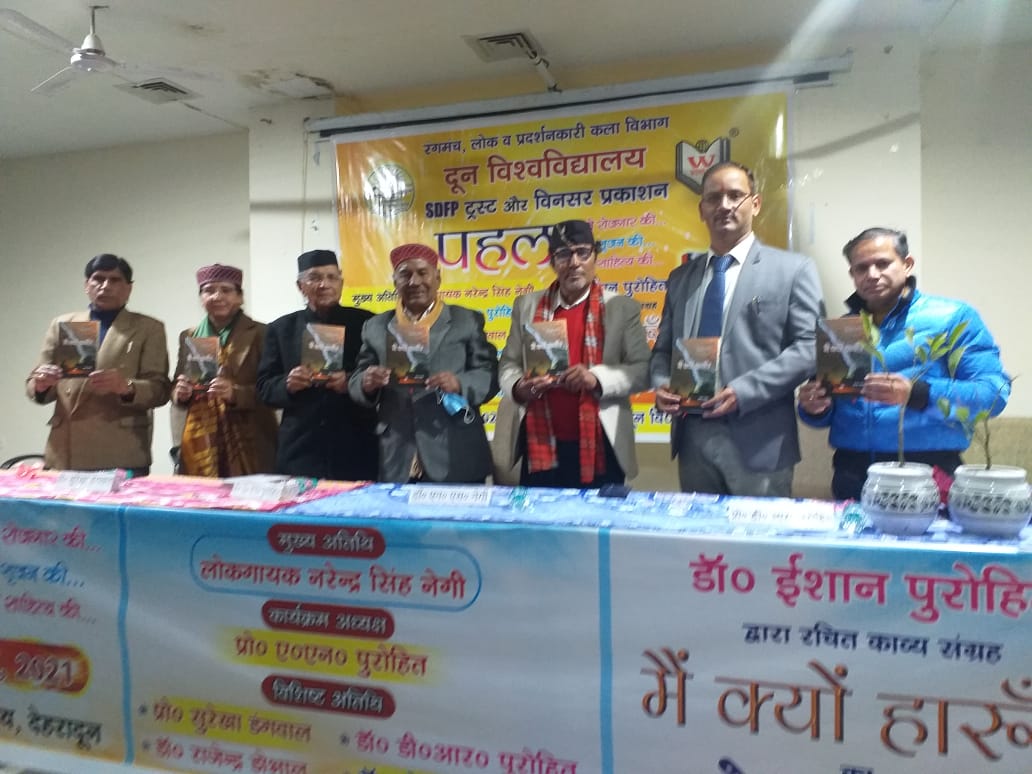 डा. ईशान पुरोहित के काव्य संग्रह ”मैंं क्यों हारु” का लोकार्पण प्रो. आदित्य नारायण पुरोहित डा. नरेंद्र सिंह नेगी, प्रो. डी. आर. पुरोहित, प्रो. सुरेखा डंगवाल, प्रो, के. सी. पुरोहित ने किया।