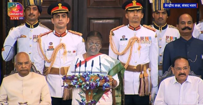 द्रोपदी मुर्मू ने अपने संबोधन में कहा कि ‘मैं जनजातीय समाज से हूँ, और वार्ड कौन्सिलर से लेकर भारत की राष्ट्रपति बनने तक का अवसर मुझे मिला है। यह लोकतंत्र की जननी भारतवर्ष की महानता है। ये हमारे लोकतंत्र की ही शक्ति है कि उसमें एक गरीब घर में पैदा हुई बेटी, दूर-सुदूर आदिवासी क्षेत्र में पैदा हुई बेटी, भारत के सर्वोच्च संवैधानिक पद तक पहुंच सकती है।’