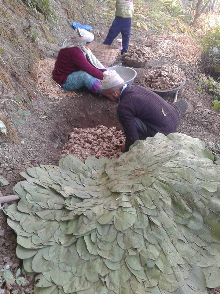 जनपद टेहरी के आगरा खाल, विकास खण्ड फगोट का कृषक अदरक बीज का सुरक्षित भंडारण करते हुए।