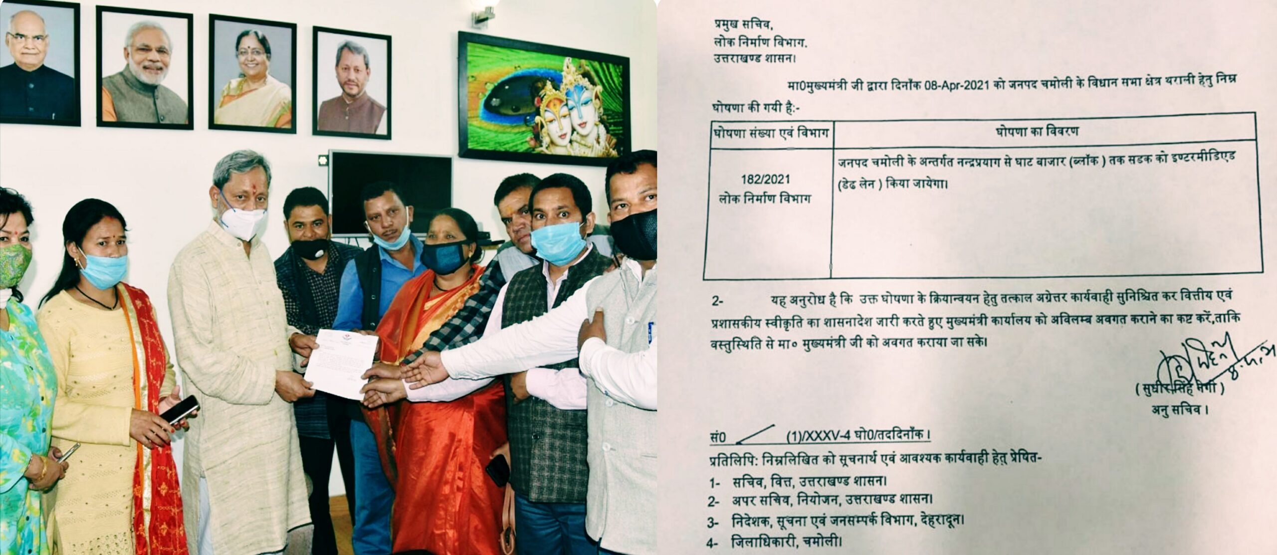 क्षेत्र की समस्या पर संज्ञान लेते हुए मुख्यमंत्री जी ने समस्या का समाधान कर दिया है। उन्होंने थराली विधान सभा के अंतर्गत आने वाले नंदप्रयाग से घाट बाजार तक की सड़क को डेढ लेन करने की घोषणा कर दी है। इसके लिए वित्त व नियोजन से लेकर लोक निर्माण विभाग को भी कार्रवाई के निर्देश जारी कर दिए हैं।