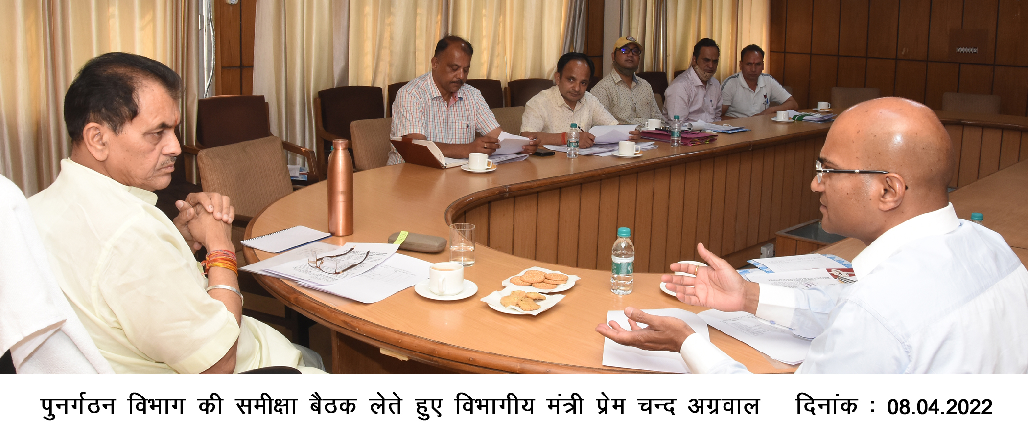 प्रदेश के पुनगर्ठन मंत्री प्रेम चन्द अग्रवाल द्वारा पुनगर्ठन विभाग की समीक्षा बैठक विधानसभा स्थित सभाकक्ष में विभागीय अधिकारियों के साथ की गई।