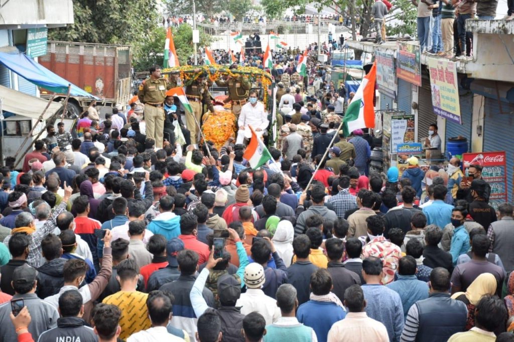 नगर मेंं जगह जगह शहीद के अंतिम दर्शन को सड़क किनारे लोग नजर आए। शहर के विभिन्न सामाजिक, राजनीतिक, व्यापारिक संगठनों ने पुष्प वर्षा कर शहीद को नमन किया।अंतिम यात्रा मार्ग पर पड़ने वाले सभी व्यापारिक प्रतिष्ठान शोक स्वरूप बंद रखे गए।
