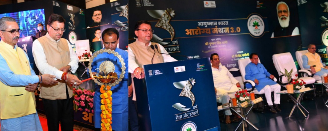 मुख्यमंत्री पुष्कर सिंह धामी ने गुरुवार को आई.एस.बी.टी देहरादून स्थित एक होटल में आयुष्मान भारत योजना के 3 वर्ष पूर्ण होने पर स्वास्थ विभाग द्वारा आयोजित आरोग्य मंथन 3.0 कार्यक्रम बतौर मुख्य अतिथि प्रतिभाग किया। इस अवसर पर मुख्यमंत्री ने आयुष्मान योजना के तहत अच्छा कार्य कर रहे 12 अस्पतालों को सम्मानित भी किया। मुख्यमंत्री श्री पुष्कर सिंह धामी ने इस अवसर पर घोषणा की कि आयुष्मान कार्ड बनाने का कोई शुल्क नहीं लिया जायेगा। सरकार द्वारा इस शुल्क का भुगतान किया जायेगा। आयुष्मान योजना के तहत सभी अस्पतालों का भुगतान एक सप्ताह के अंदर किया जायेगा।