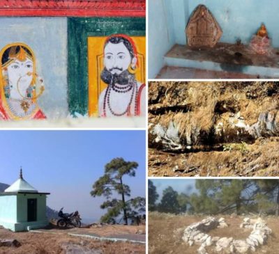 हमने अपनी बाईक वापिस मोड़ ली। दो किलोमीटर वापिस आने के बाद मुख्य सड़क के दांयीं ओर एक छोटा सा मंदिर नजर आया। यह गोपीचंद का मंदिर था। हमने अपनी बाईक वहीं पर खड़ी कर दी और हेलमेट को मंदिर के भीतर राजा गोपीचंद की सुरक्षा में रख दिया। सामने पहाड़ी देखकर हमने रास्ते का अनुमान लगाया, सड़क पर कुछ कदम चलने पर हमें उपर की ओर जाने वाला पैदल मार्ग दिखाई दे गया। हम उस रास्ते आगे बढ़ चले। अंदाजे से हम पहाड़ी चढ़ाई चढ़ते रहे। डेढ़ घंटे की चढ़ाई वाला रास्ता तय करने के बाद आखिर हम उस जगह पहुंच ही गये जहां किसी किले या गढ़ की संभावना हो सकती है। इस पहाड़ी के टाॅप पर जगह समतल थी, बड़े बड़े चट्टानी पत्थर पड़े हुये थे और तीनों तरफ ढंगार (खाई) था। केवल एक ही तरफ से यहां आया जा सकता था जिधर से हम आये थे। गढ़ ऐसी ही जगह बनाये जाते थे। एक जगह पत्थरों से एक छोटी सी चकोर दिवार की शक्ल में कुछ पत्थर रखे हुये थे जो शायद जानवर चराने वालों ने रखे होंगे। यह जगह काफी रमणीक थी। इस उंचांई से हम दूर-दूर तक देख सकते थे।