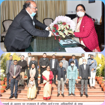 राज्यपाल श्रीमती बेबी रानी मौर्य शुक्रवार को नववर्ष के अवसर पर राजभवन में वरिष्ठ आई.ए.एस. अधिकारियों ने भेंट कर शुभकामनाएँ दी।
