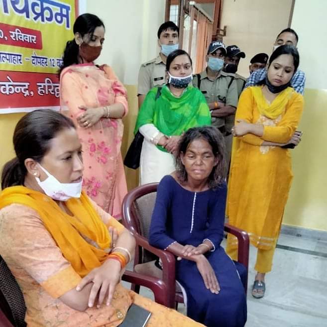 फुटपाथ पर भीख मांगती कुमाऊं यूनिवर्सिटी में वाइस प्रेसीडेंट रही हंसी प्रहरी से की राज्य मंत्री रेखा आर्या ने मुलाकात।