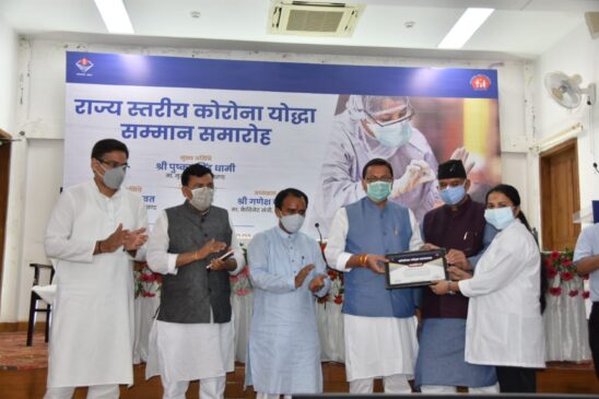 सोमवार को मुख्यमंत्री कैम्प कार्यालय स्थित जनता दर्शन हॉल में स्वास्थ्य विभाग द्वारा आयोजित राज्य स्तरीय कोरोना योद्धा सम्मान समारोह में मुख्यमंत्री पुष्कर सिंह धामी ने राज्य के लगभग 50 कोरोना योद्धाओं को सम्मानित किया।