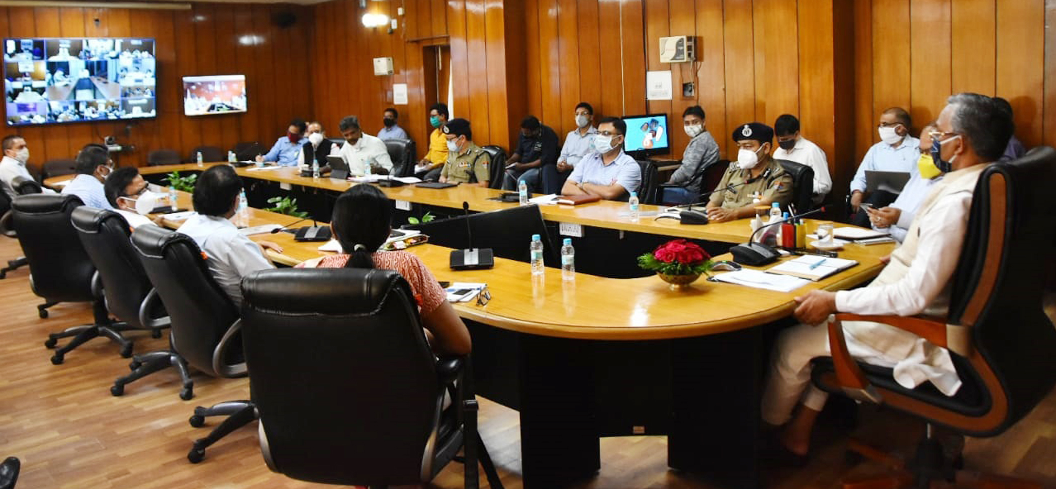 इस अवसर पर अपर मुख्य सचिव श्रीमती राधा रतूड़ी, डीजी लॉ एण्ड ऑर्डर अशोक कुमार, सचिव आर. के सुधाशु, नितेश झा, श्री एस. ए. मुरूगेशन, आईजी संजय गुंज्याल, महानिदेशक सूचना डॉ. मेहरबान सिंह बिष्ट, महानिदेशक स्वास्थ्य डॉ. अमिता उप्रेती एवं वीडियो कॉफ्रेंस के माध्यम से सभी जिलाधिकारी, वरिष्ठ पुलिस अधीक्षक एवं सीएमओ उपस्थित थे।