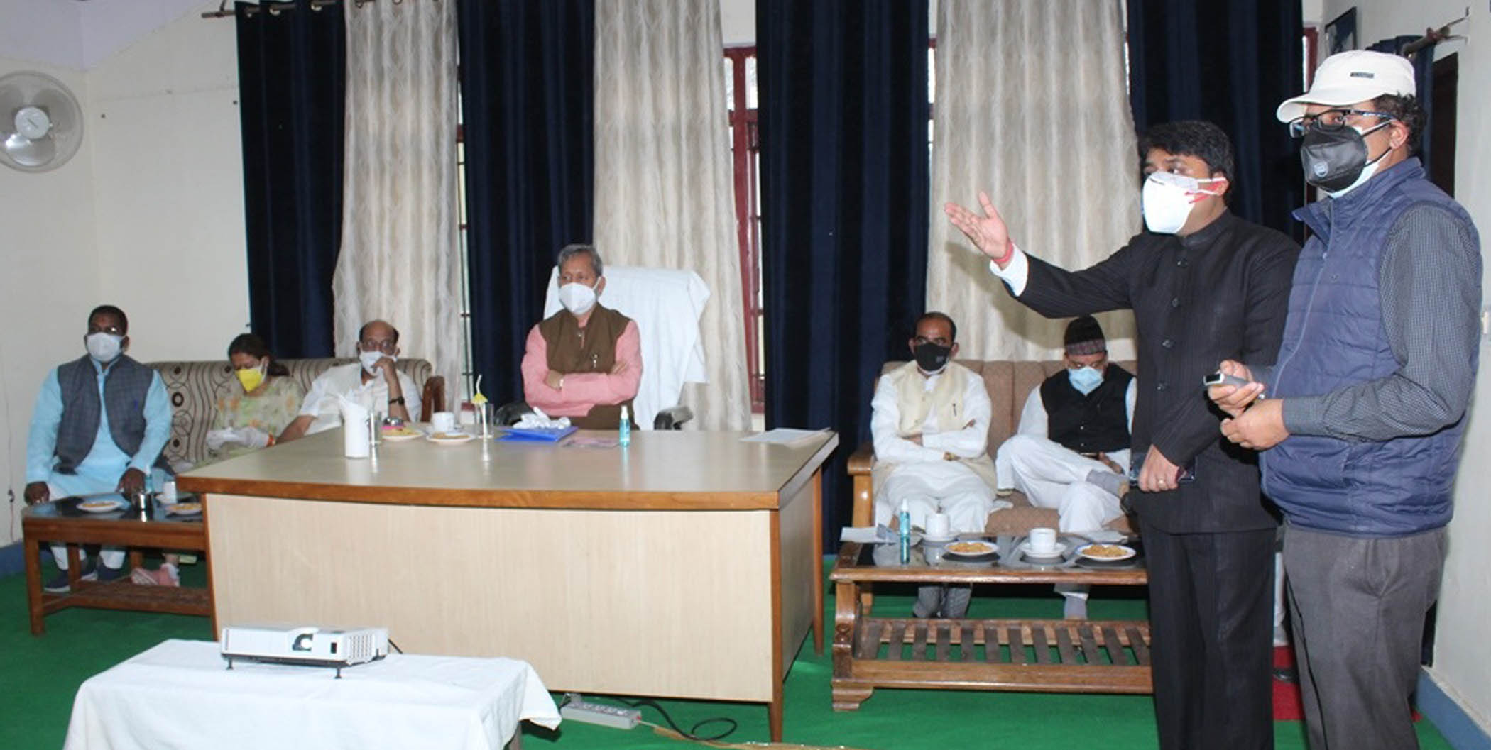 जिलाधिकार नितिन सिंह भदौरिया ने जनपद में करोना संक्रमण की रोकथाम एवं आवश्यक तैयारियों की पॉवर पाइंट प्रजेंटशन के माध्यम से मुख्यमंत्री के सम्मुख रखी। इस दौरान प्राचार्य मेडिकल कालेज आर.जी. नौटियाल ने भी मेडिकल कालेज के कार्यों की प्रगति व समस्याओं के बारे में मुख्यमंत्री को अवगत कराया जिस पर उन्होंने शीघ्र समाधान करने का आश्वासन दिया। इस दौरान मा0 विधानसभा उपाध्यक्ष रघुनाथ सिंह चौहान, सांसद अजय टम्टा, विधायक महेश नेगी, विधायक महेश जीना ने कई समस्यायें सम्बन्धित क्षेत्र से मुख्यमंत्री के सम्मुख रखी जिस पर उन्होंने उचित कार्यवाही का आश्वासन दिया।