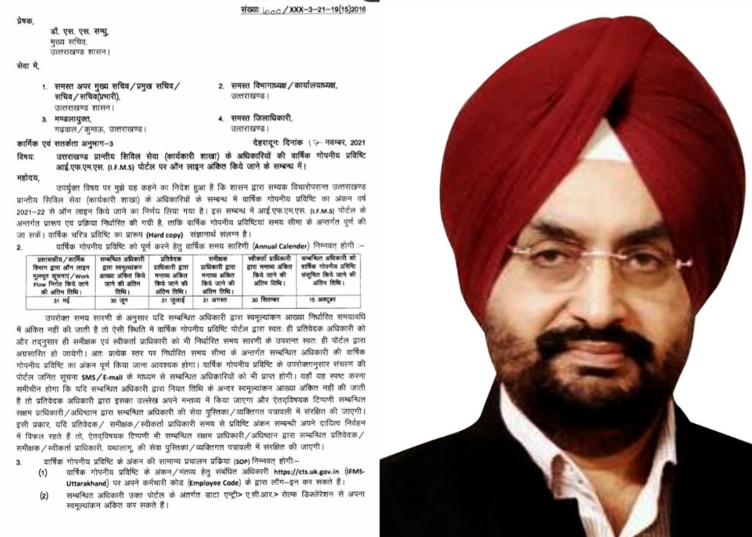मुख्य सचिव डॉ. सन्धु द्वारा अधिकारियों को दिए गए निर्देश के अनुक्रम में सचिव कार्मिक अरविन्द सिंह ह्यांकी द्वारा उत्तराखण्ड प्रान्तीय सिविल सेवा (कार्यकारी शाखा) के अधिकारियों की वार्षिक गोपनीय प्रविष्टि आई.एफ.एम.एस. पोर्टल पर ऑनलाइन किए जाने के निर्देश दिए गए हैं। उन्होंने बताया कि उत्तराखण्ड प्रान्तीय सिविल सेवा (कार्यकारी शाखा) के अधिकारियों की वार्षिक गोपनीय प्रविष्टि का अंकन वर्ष 2021-22 से ऑनलाइन प्रक्रिया हेतु समय-सीमा भी निर्धारित की गयी है, ताकि वार्षिक गोपनीय प्रविष्टि निर्धारित समय-सीमा के अन्तर्गत पूर्ण की जा सके।