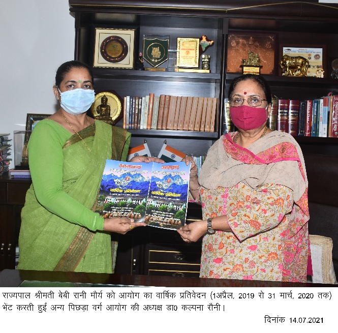 राज्यपाल श्रीमती बेबी रानी मौर्य से बुधवार को राजभवन में उत्तराखण्ड अन्य पिछड़ा वर्ग आयोग की अध्यक्ष डा0 कल्पना सैनी ने शिष्टाचार भेंट की। उत्तराखण्ड अन्य पिछड़ा वर्ग आयोग की अध्यक्ष डा0 कल्पना सैनी ने राज्यपाल श्रीमती मौर्य को आयोग का वार्षिक प्रतिवेदन (1अपै्रल, 2019 से 31 मार्च, 2020 तक) भेंट किया।
