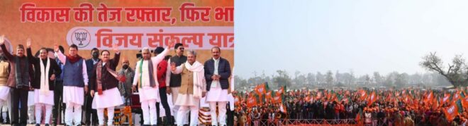 उत्तराखण्ड में आगामी विधानसभा चुनाव को देखते हुए भाजपा के इस बार ‘साठ पार’ लक्ष्य निर्धारित किया है। प्रदेश के कुल 70 विधानसभा सीटों में से 60 सीटें जीतने के लिए नारा भी ‘सिक्सटी प्लस’ का दिया गया है। इसी नारे के साथ भाजपा ने बीते शनिवार को हरिद्वार से गढ़वाल मण्डल के लिए विजय संकल्प यात्रा की शुरूआत की जबकि कुमाऊं मण्डल के लिए इस यात्रा का आगाज आज केन्द्रीय मंत्री अनुराग ठाकुर बागेश्वर से करेंगे। जैसी की उम्मीद दी हरिद्वार में निकाली गई विजय संकल्प यात्रा में पार्टी कार्यकर्ताओं की अभूतपूर्व भीड़ जुटी। पार्टी के राष्ट्रीय अध्यक्ष जेपी नड्डा ने मुख्यमंत्री पुष्कर सिंह धामी के साथ हरिद्वार में विजय संकल्प यात्रा को रवाना किया। नड्डा सहित केंद्रीय राज्य मंत्री अजय भट्ट, सांसद डॉ. रमेश पोखरियाल निशंक, भाजपा प्रदेश अध्यक्ष मदन कौशिक सहित विजय संकल्प रथ पर सवार शीर्ष नेताओं का जगह-जगह जारेदार स्वागत हुआ। यात्रा के स्वागत में धर्मनगरी के लोग जगह-जगह सड़क के दोनों छोर पर खड़े होकर पुष्प वर्षा कर रहे थे।